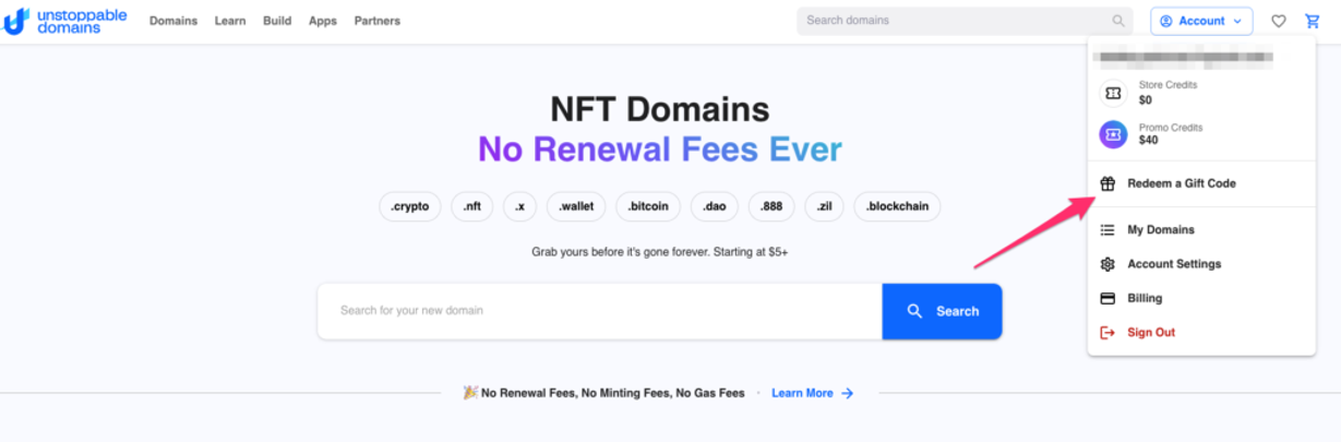 If you’re an active Permission member, keep an eye on your inbox, we’ll be emailing you a unique code this week. Sign up or log into your Unstoppable Domains account and select Redeem a Gift Code from the Account drop down on the top right.